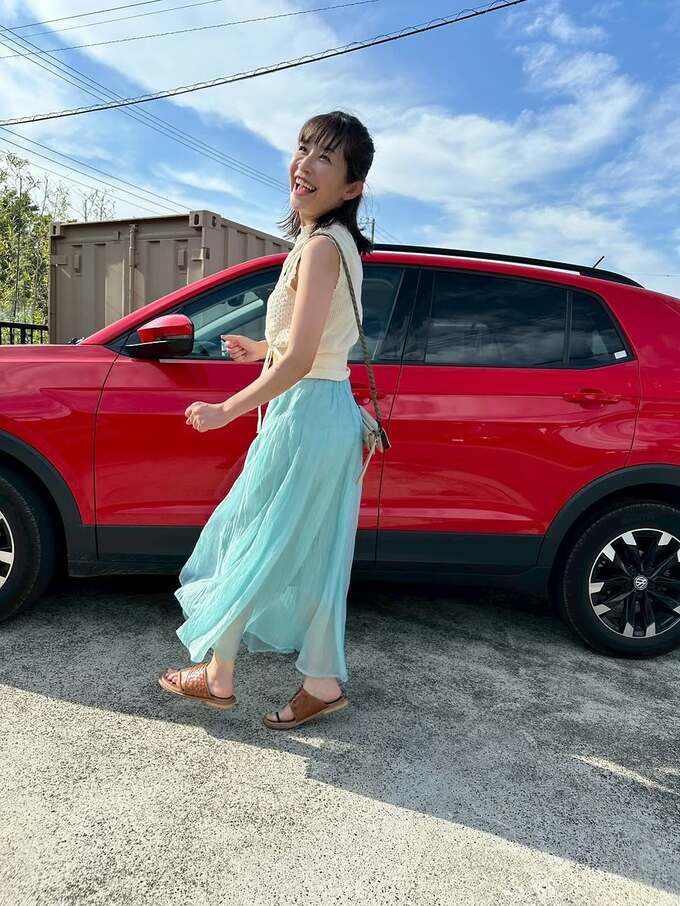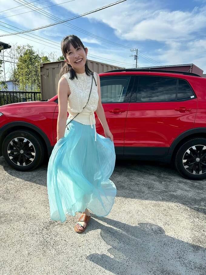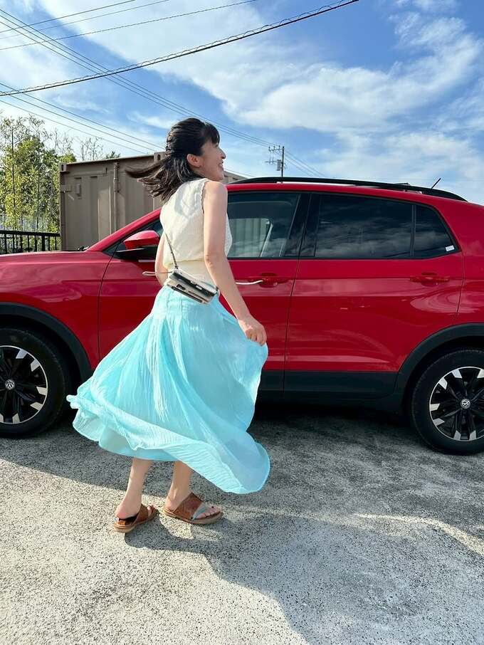 赤い愛車の前で、水色のスカートが風になびく画像を投稿した小野さんは、「大した奇跡は起きませんでしたが 赤い愛車に水色スカートで コントラストが綺麗な写真が撮れました \(^ω^)/」と報告しています。