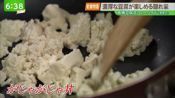 フライパンで豆腐の水分を飛ばしてガジャガジャと炒める様子から、「がじゃがじゃ丼」と名付けました。
