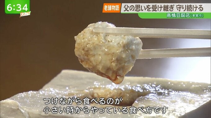 --鈴木さん(高橋豆腐店)「豆腐の中心をくり抜いて、そこにごま油を垂らして、醤油を入れてつけながら食べるっていうのが、ちっちゃい時からやっている食べ方です。」