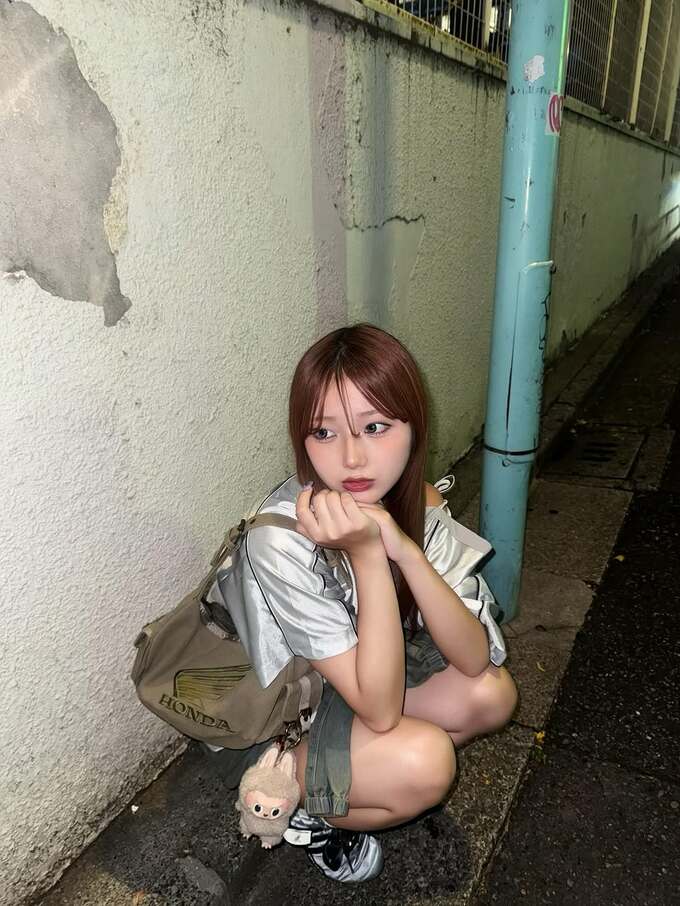 希空さんの写真には、全てのカットに〝ラブブ Labubu〟が一緒に写っています。また、古びた壁の前でしゃがむ姿を捉えた写真では、バッグに『HONDA』の文字が見えます。