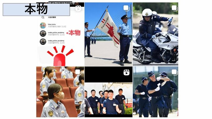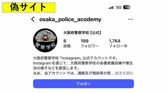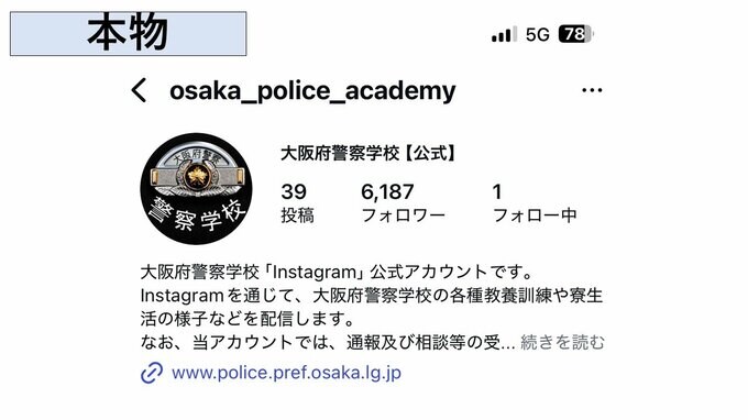 公式アカウントは、「osaka_police_academy」ですが、偽アカウントは「academy」の「a」の部分が「o」になっています。