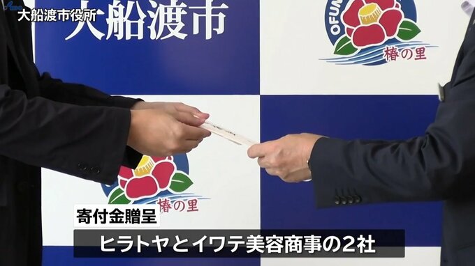 大船渡市に寄付金を贈ったのは、ヒラトヤとイワテ美容商事です。
