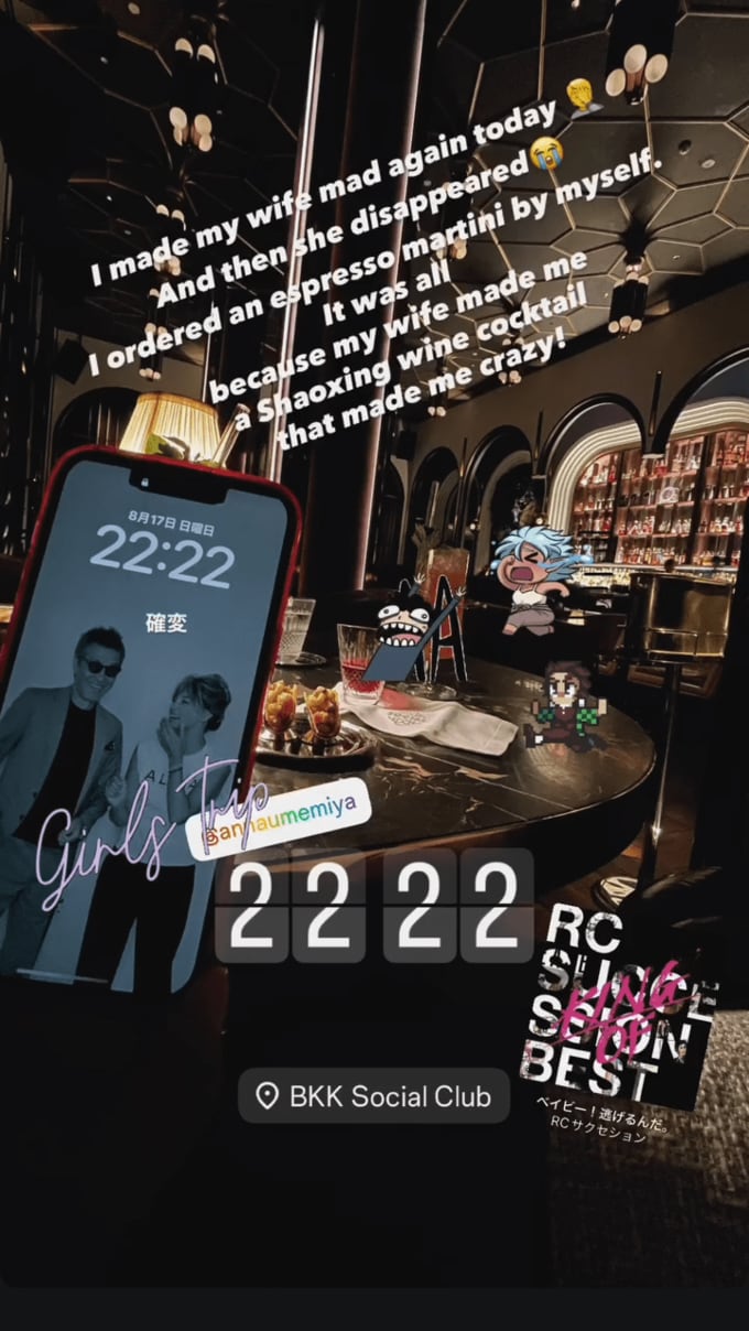 そこに世継さんは、「I made my wife mad again today」(僕は妻をまた怒らせてしまいました)「And then she disappeared」(そして彼女は僕を置いて姿を消しました)「It was all because my wife made me a Shaoxing wine cocktail that made me crazy!」(その理由は、彼女が作ってくれた紹興酒のカクテルで、僕が酔ってヘンになってしまったからです!)と文字を載せて、予期せぬ一幕を明かしています。