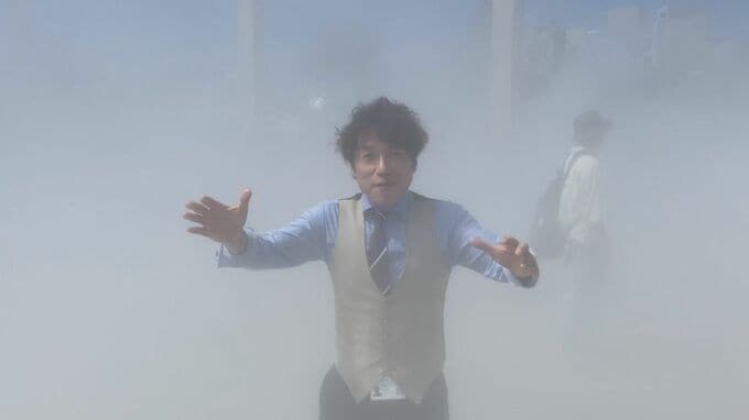 (大石)「始まりました。下からミストが吹き出してきました!あー、涼しい涼しい!まわりから子どもたちが入ってきました!」