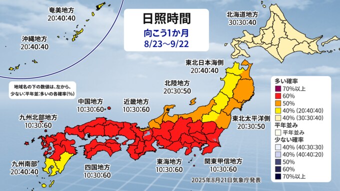 このため、奄美・沖縄、西日本、東日本は降水量が平年より「少なく」、晴れる日が多いでしょう。