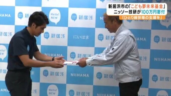 子どもたちの教育に役立ててもらおうと、愛媛県新居浜市内の会社が市の「こども夢未来基金」に100万円を寄付しました。寄付をしたのは防水工事などを手がける新居浜市のニッソー技研で、宮部雄一郎社長が21日…