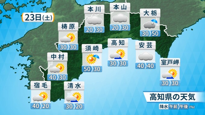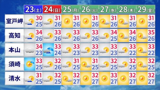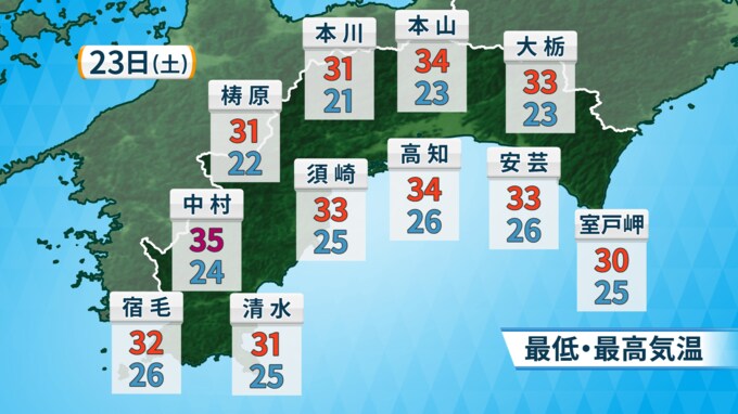 朝の最低気温は、前日と同じくらいかやや高くなるところが多くなるでしょう。日中の最高気温は、平野部、山沿いともに30度以上の真夏日となるところが多く、四万十市中村では35度の猛暑日予想となっています。
