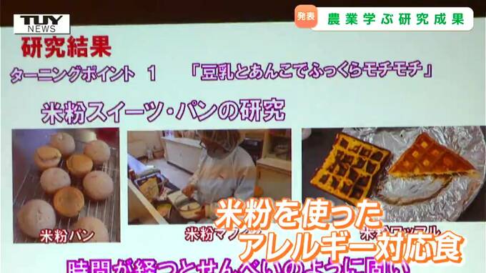 置賜農業高校高校の2人が発表したのは、米粉を使ったアレルギー対応食の開発について。