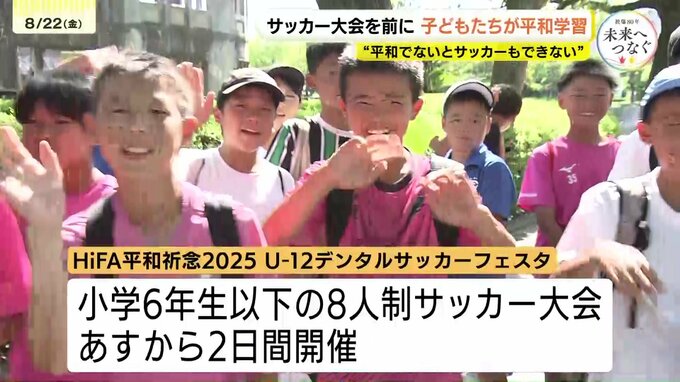 このあと、子どもたちは原爆資料館を見学したり、慰霊碑に献花したりしました。この大会は、小学6年生以下の子どもたちによる8人制サッカーの大会で、試合はあすから2日間行われます。