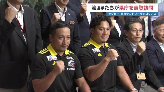 明日23日に熊本市で開かれるラグビーのイベントを前に、東京サントリーサンゴリアスの選手たちが熊本県庁を訪問しました。県庁を訪れたのはキャプテンの堀越康介選手と、現在の岱志高校出身で副キャプテンの流大選…