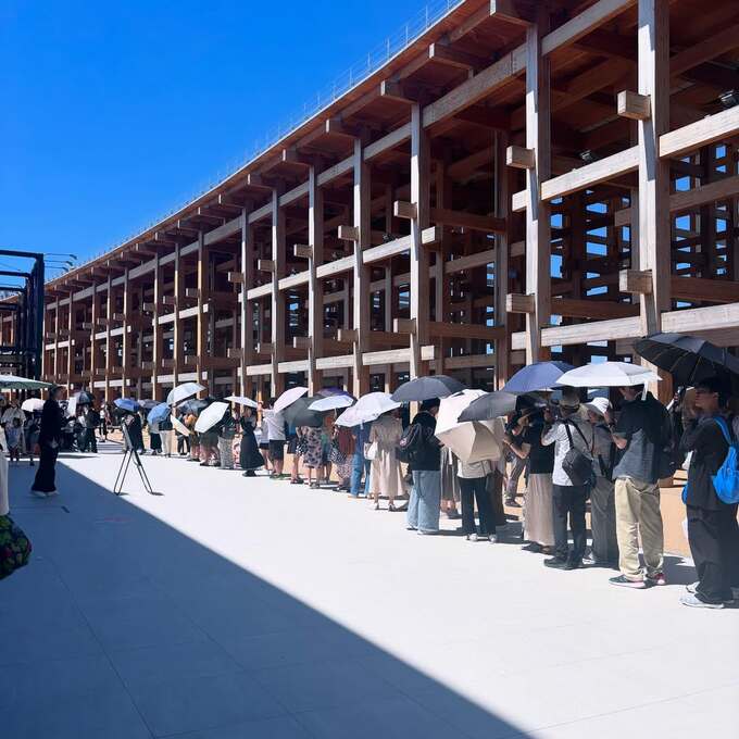 そんな根本さんは「万博そこは。。日傘がないと生きられない世界」とテキスト。普段「公共空間の創出」を研究テーマに据えて「暑熱緩和の街作り」「パラソル設置事業」に取り組んでいる根本さんらしい視点で注目しています。パビリオンの入場待ちの行列の方々はみな日傘を差していて、根本さんは「ぜひ日除け増やしてくれたらいいな〜」と思いを綴りました。