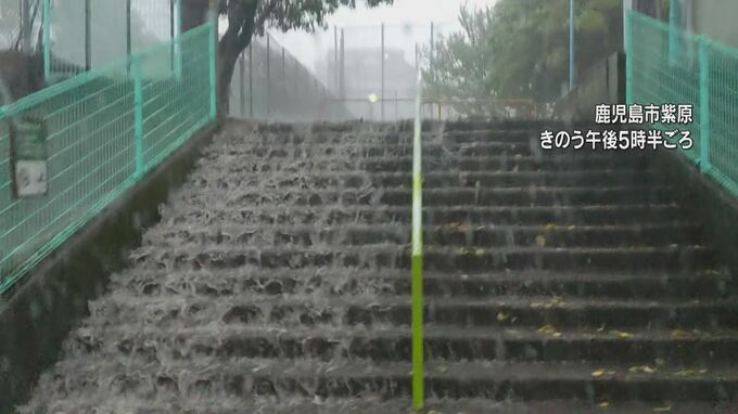 鹿児島市では横殴りの雨で、視界が真っ白に。大量の雨水で、階段もまるで滝のようです。