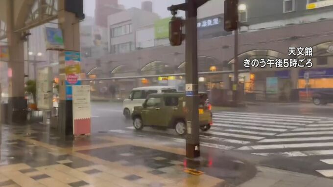 午後5時の鹿児島市です。打ちつける雨は波のようになり、車が水しぶきをあげています。