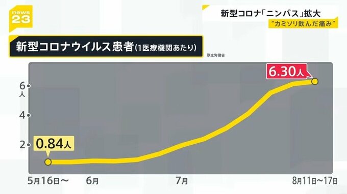 厚生労働省によりますと、8月11~17日までの1週間に報告された新型コロナの感染者数は「2万2288人」。1医療機関あたりの患者数は「6.30人」と増加傾向が続いています。