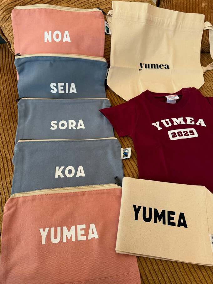 続く写真で「名前入りのバッグをいただいたんですが、並べると、とてもわかりやすい」と、各々の名前がアルファベットでプリントされたバッグを並べています。
