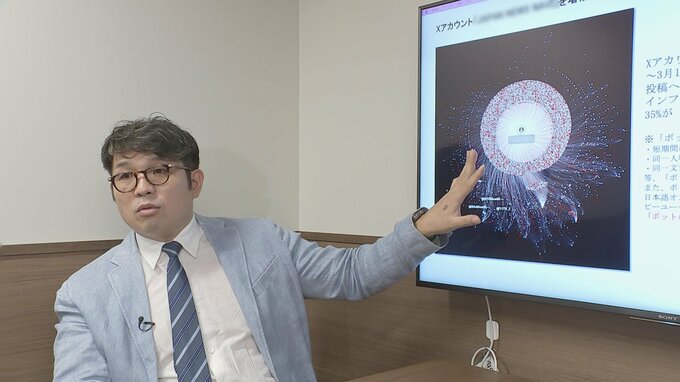 情報空間の分析を専門とする会社「Japan Nexus Intelligence」の代表で、平デジタル大臣に情報提供をしたという髙森雅和氏は、Xのあるアカウントの投稿が拡散される過程を分析したところ、その約35%がプログラミングによるものだった可能性があるという結果が出たと話す。