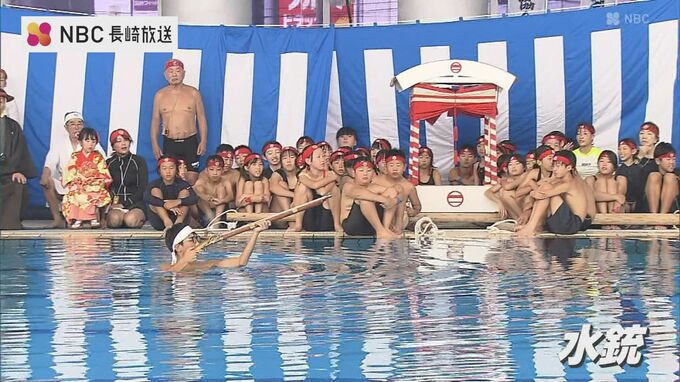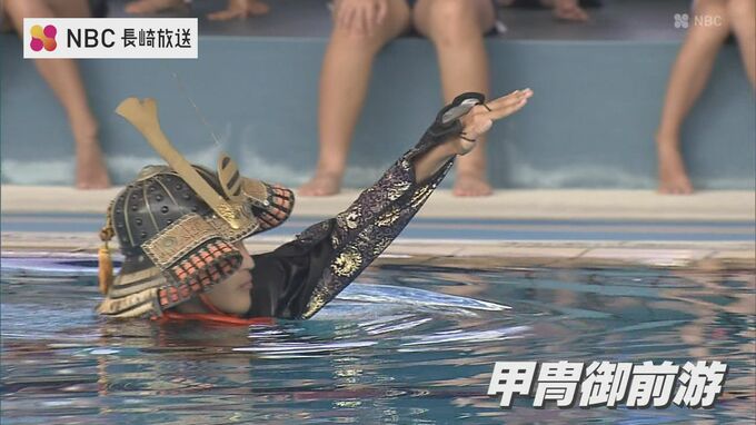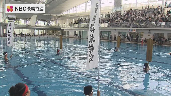 長崎市で開かれている夏季水泳教室で23日、恒例の「大名行列」が行われ、子どもたちがこの夏の練習の成果を披露しました。