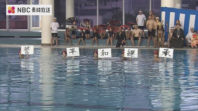 泳ぎながら筆をしたためる水書では、被爆80年にちなんで平和の継承を誓いました。