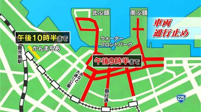 大会に伴い、会場周辺では交通規制が行われています。車両通行止めとなるのは赤色で示した部分が午後9時半まで、黄色で示した部分が午後10時半までです。