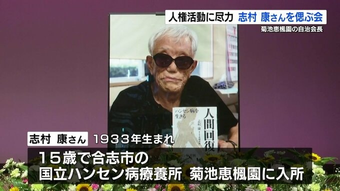 5月に亡くなった国立ハンセン病療養所 菊池恵楓園の入所者自治会長を務めた志村康さんを偲ぶ会が開かれました。志村康さんは1933年に佐賀県で生まれ、15歳のときに合志市の国立ハンセン病療養所菊池恵楓園に入所し…