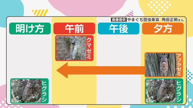 主にクマゼミは午前中にしか鳴きません。アブラゼミはもともと夕方ですが、鳴く数が増えると1日中鳴きます。ヒグラシは夕方や明け方といった薄暗い時間帯に鳴くそうです。