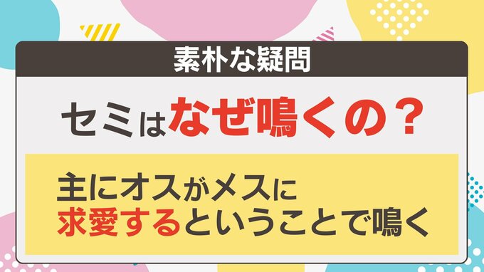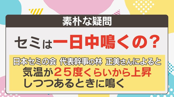 日本セミの会・代表幹事の林正美さんによると、セミは気温が25度くらいから上昇しつつあるときに鳴くそうです。