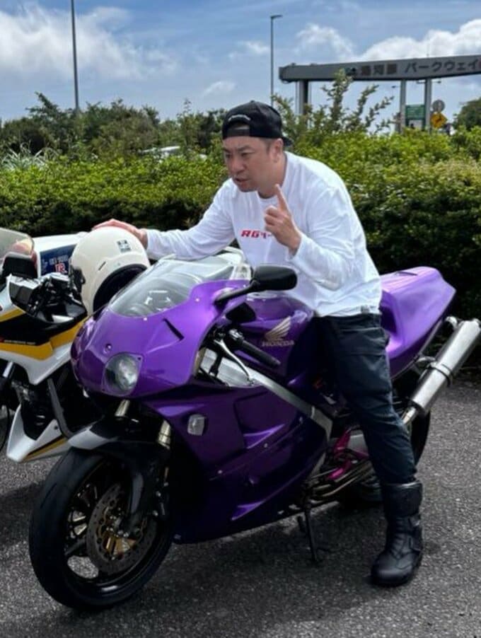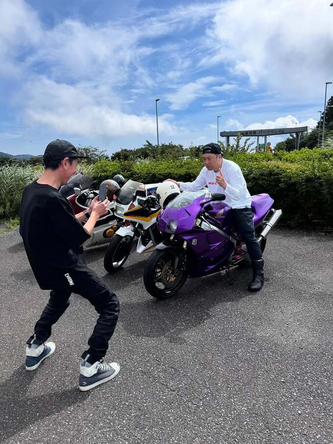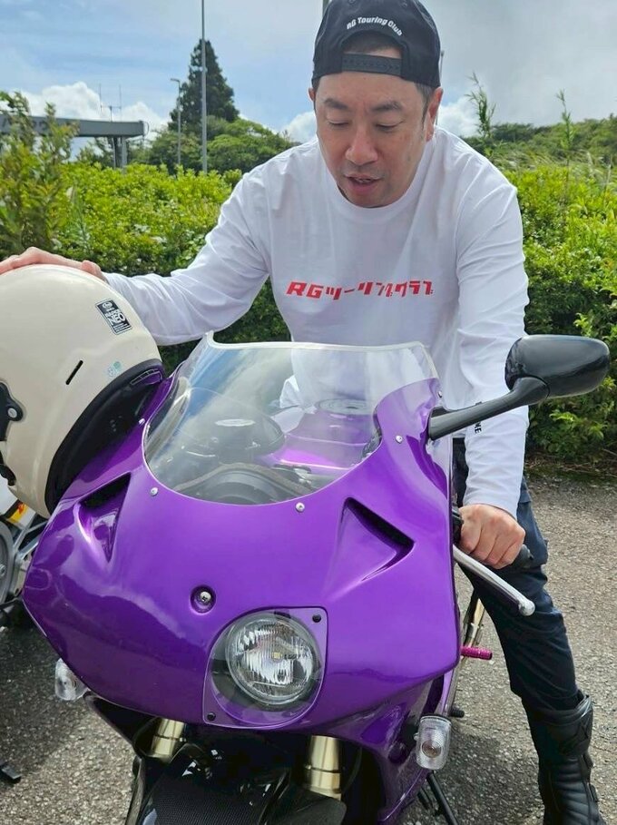 更に、続く投稿で、レイザーラモンRGさんは「RGツーリングクラブと行く 南足柄市周遊 安全走行御祈願ツーリング、チュートリアル福田渾身のカスタム『90年代の走り屋風パープルのRVF400』をこの日に合わせて仕上げて乗ってきて爆笑しました!さすがすぎる!こんなんしたい!」と綴ると写真をアップ。