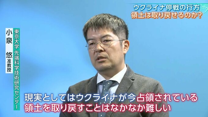 「現実としては、ウクライナが今占領されている領土を取り戻すことはなかなか難しい。国際法的に(ロシア領だと)認めてしまえばいいのではないかという議論はアメリカにある。ただ、これはウクライナとしては受け入れることができない。これは日本の北方領土問題もそうだと思う。ロシアが実効支配をしているが、同時にロシア領と認めるわけでもない。同じようなスタンスをロシアの占領地域に対してもウクライナはとり続けるだろう」