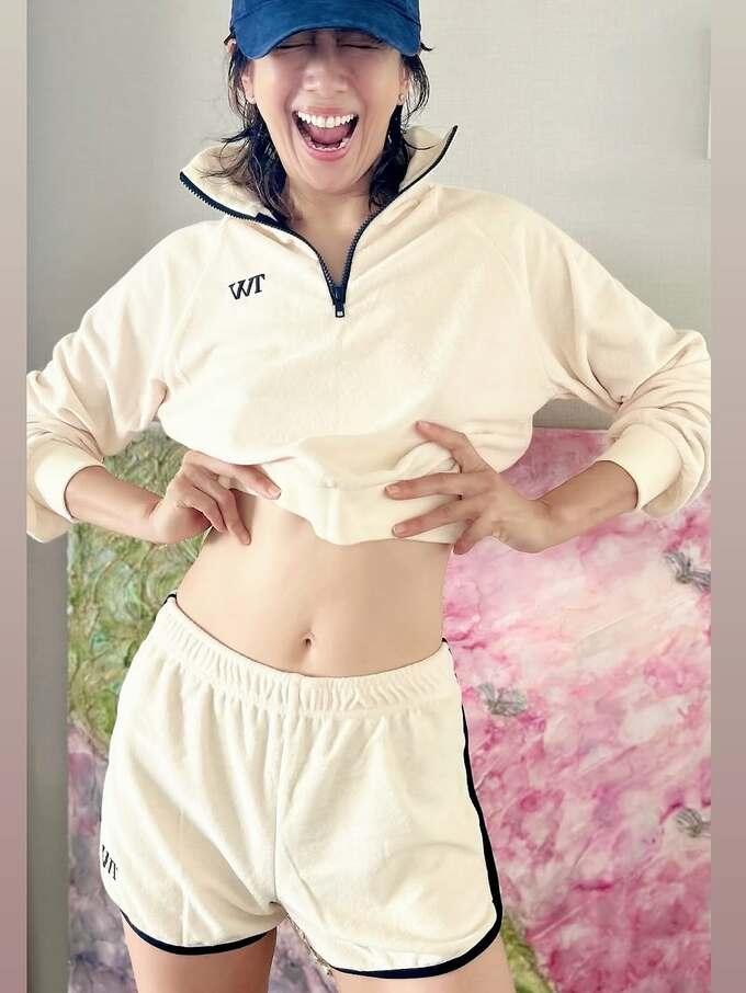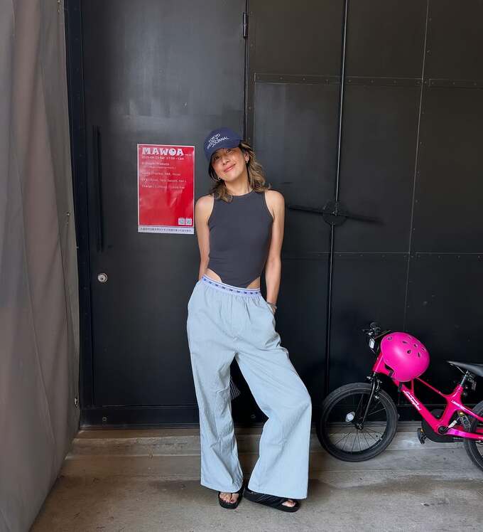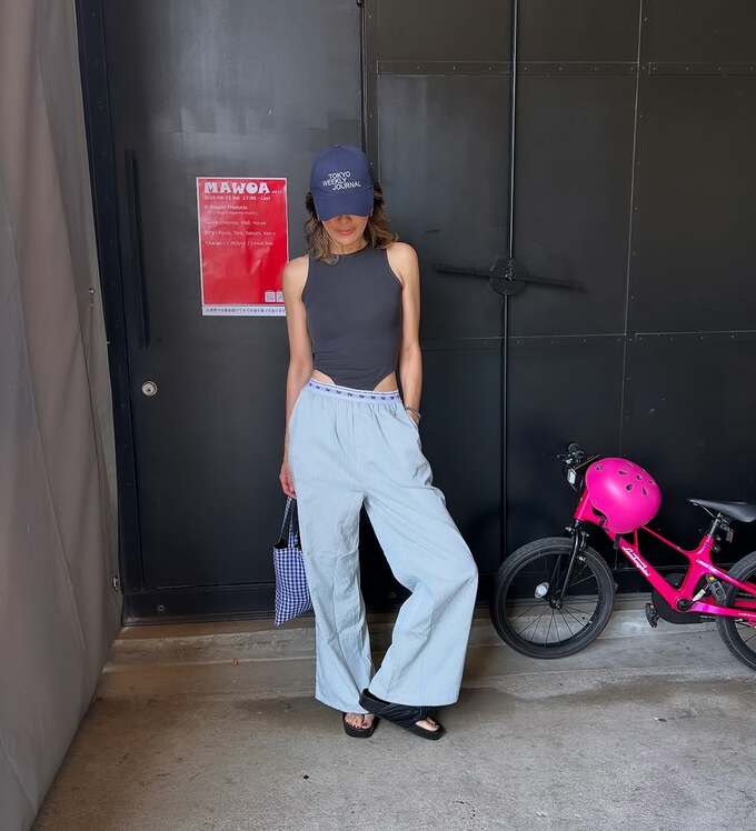 投稿された写真では、黒いノースリーブトップスとブルーのワイドパンツという爽やかな夏のコーディネートで、グレーのキャップを被り、リラックスした表情を見せています。