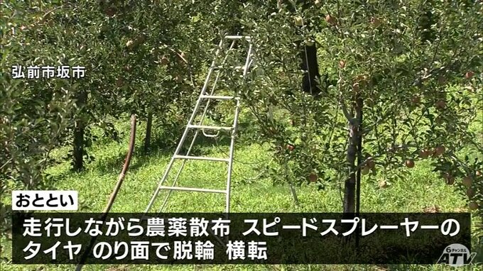 23日午後6時ごろ、弘前市坂市にあるリンゴ畑で、走行しながら農薬を散くスピードスプレーヤーのタイヤがのり面で脱輪して横転しました。