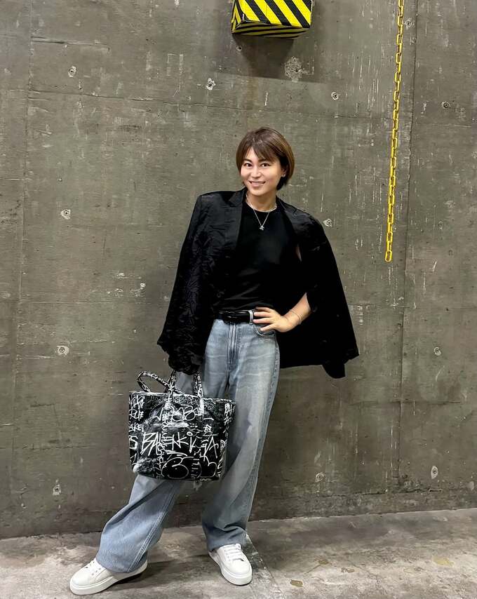 投稿に添えられた写真では、氷川さんが黒いジャケットを肩に羽織り、黒のトップスとジーンズ、白いスニーカーという私服姿でポーズをとっています。片手を腰に当て、リラックスした表情を見せながら、もう一方の手には黒地に白のデザインが施されたバッグを持っています。