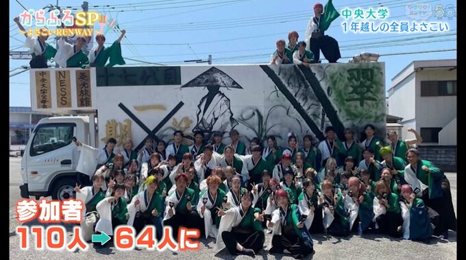 出発直前、参加者は110人から64人に減りました。およそ半数のメンバーが高知への「道」を断念したのです。参加したメンバーたちは来られなかった仲間たちの名前を鳴子に記し、思いを一つに踊りました。