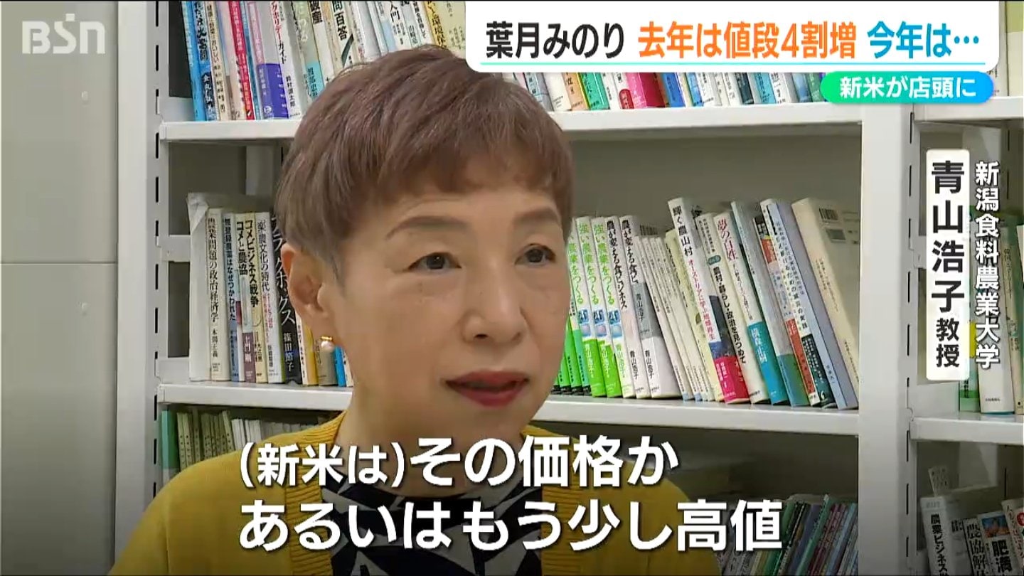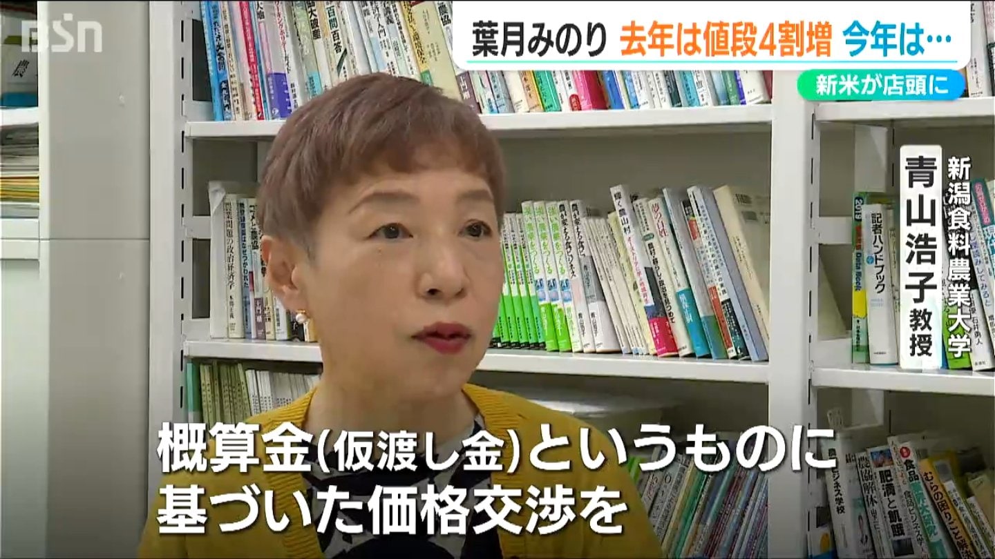 【新潟食料農業大学 青山浩子 教授】「当然ながら、JAは概算金(仮渡し金)というものに基づいた価格交渉を卸売業者さんとするわけなので、卸売市場も、今までずっと、もう2年間米が足りない状況が続いていたので、ここに来て急に“そんな価格じゃ買えませんよ”とは言えないと思いますから、一定の高値が新米と同時に価格としてつけられるのかなとは予想してます」
