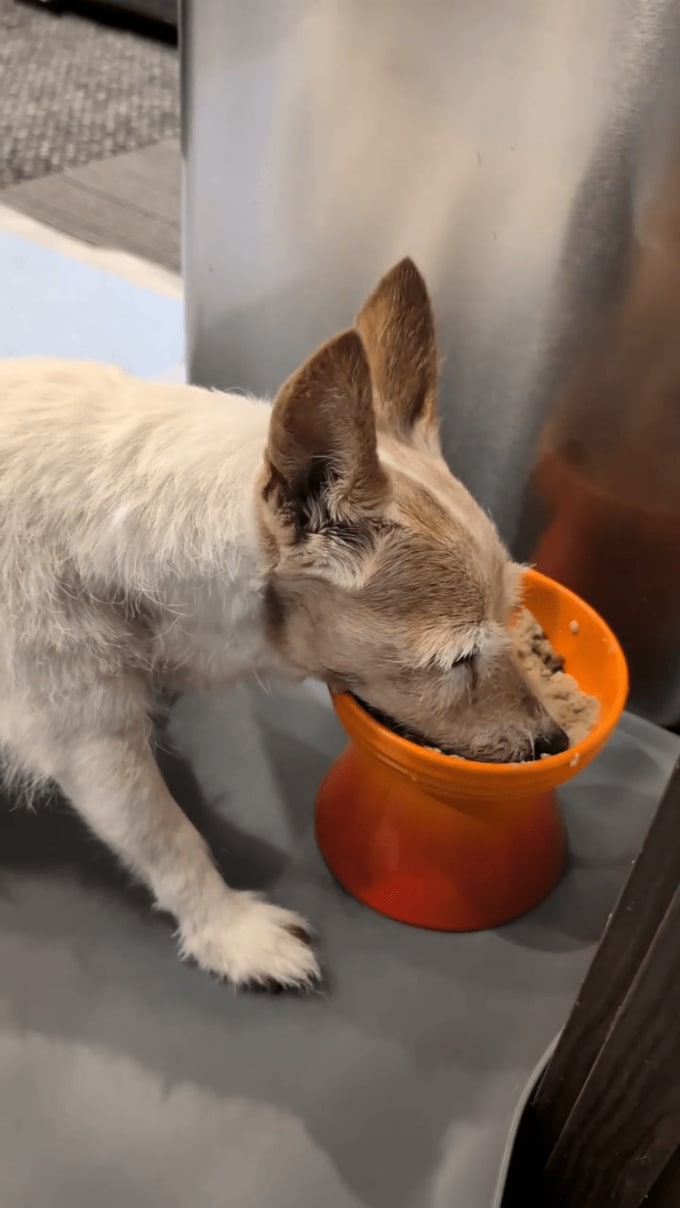 投稿された動画では、高齢にもかかわらず、あふれる食欲で、照英さんの愛犬が、オレンジ色の食器に顔を突っ込み熱心に食事をする姿が映し出されています。