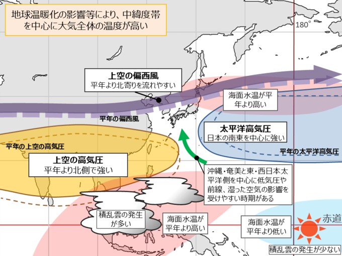 太平洋のフィリピン周辺などで積乱雲の発生が多いということは、上昇気流が強まっているということです。その際、日本付近では「上空に登った空気が下に降りようとして」下降気流が発生しやすく、その影響で高気圧の勢力が強くなることがあります。(これを「PJパターン」と呼びます。太平洋のPacific、日本のJapanの頭文字を取って名付けられました)