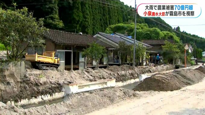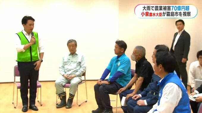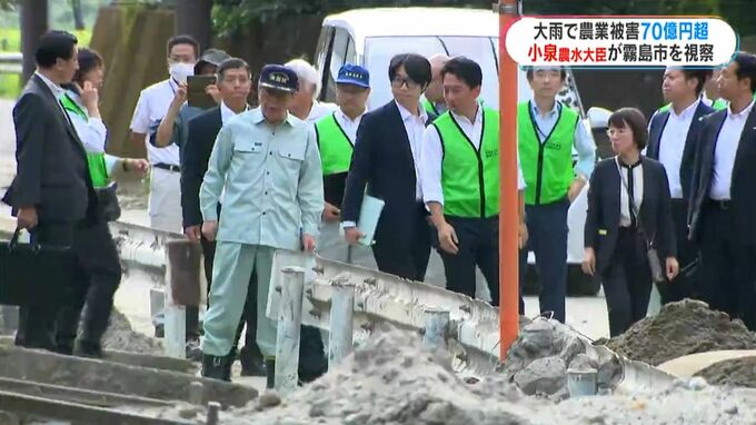 小泉進次郎農林水産大臣が25日、集中豪雨で被害が出た鹿児島県霧島市の現場を視察しました。県全体の農業被害額がおよそ70億円に上る中、コメ農家とも意見交換し、復旧に向けて支援を急ぐ考えを示しました。