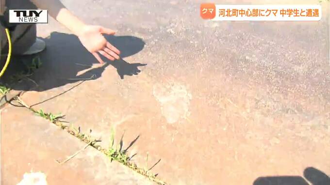 大塚美咲アナウンサー「河北町のクマが目撃された現場です。こちらをご覧ください。足元を見ますと、クマの足跡と思われるものが続います。そしてその先を見ますと、わかりますでしょうか、草がなぎ倒されている、クマが通った痕跡と思われるものが続いています」