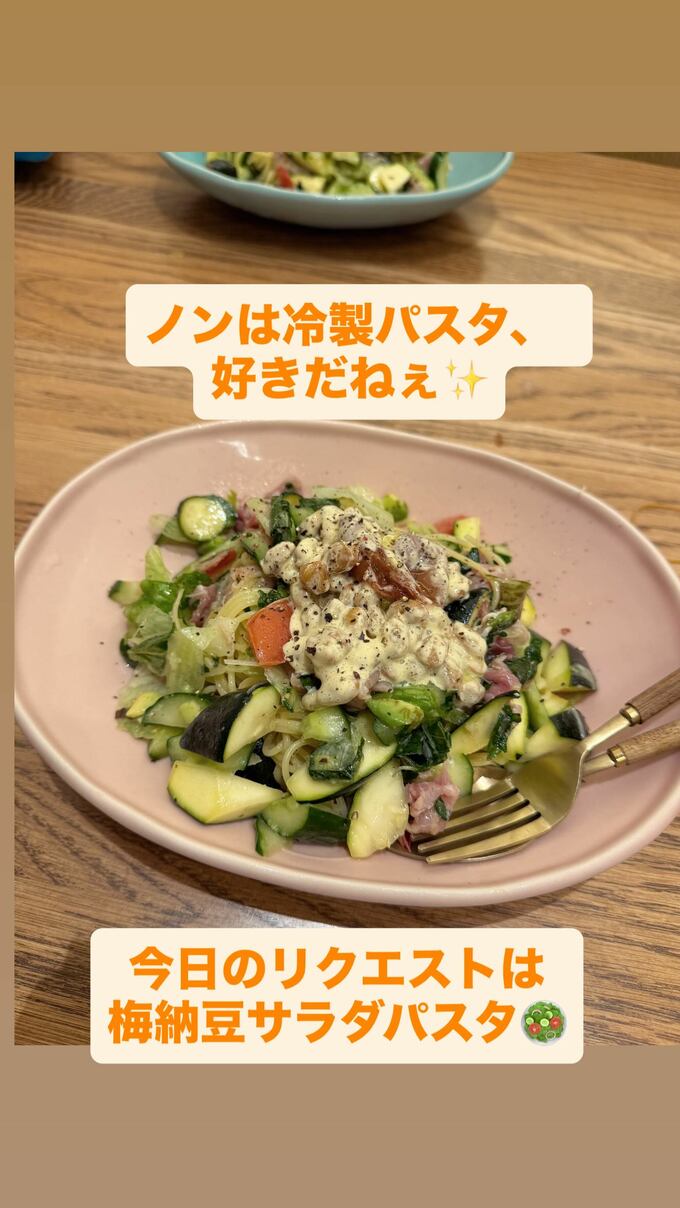 また別の投稿では、食事の様子も共有されています。「ノンは冷製パスタ、好きだねぇ」「今日のリクエストは梅納豆サラダパスタ」というテキストと共に、妻・辻希美さんのために作ったとみられるピンク色の皿に盛られた冷製パスタの写真が掲載されています。パスタにはズッキーニやトマト、レタスなどの野菜とクリーミーなソースがかけられ、ブラックペッパーがトッピングされていました。