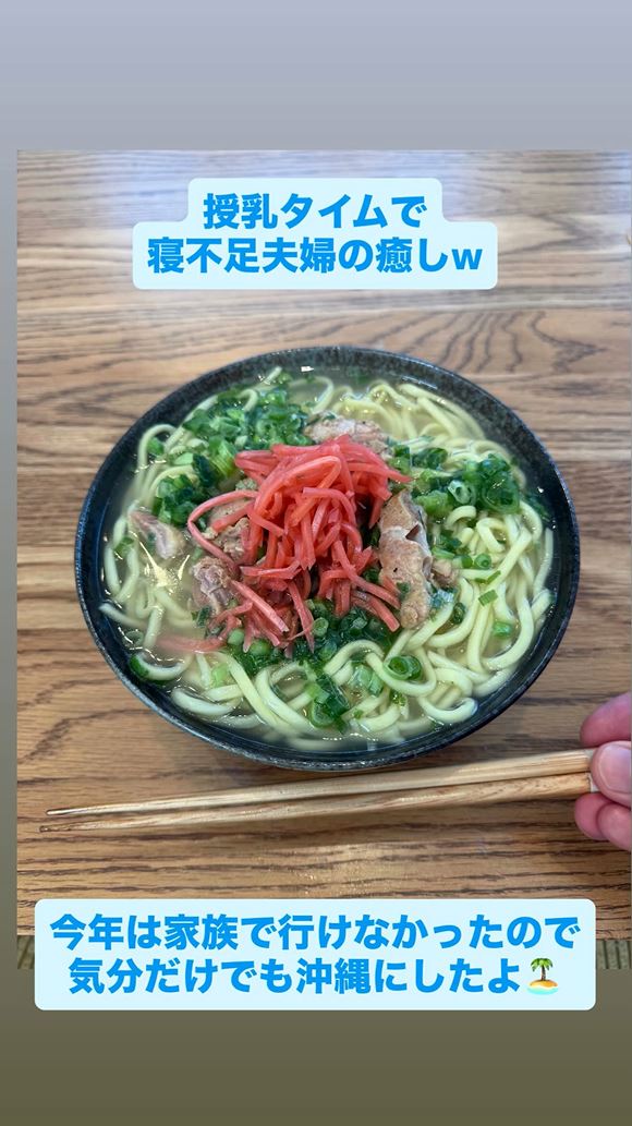 さらに「授乳タイムで寝不足夫婦の癒し」「今年は家族で行けなかったので気分だけでも沖縄にしたよ」というコメントと共に、木製のテーブルに置かれた沖縄そばの写真も投稿されています。黒いどんぶりに盛られたそばには、ネギと紅生姜がたっぷりとトッピングされていました。