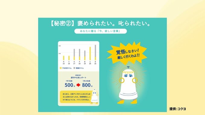 コクヨ広報によると、「大人は誰も褒めてくれず、叱ってもくれない。1週間の勉強効果に応じて叱咤激励が届く」ということで、今人気になっているということです。