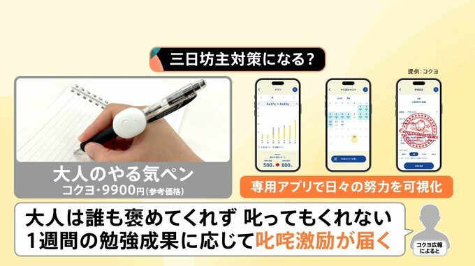 どういった商品なのかというと、コクヨが販売している「大人のやる気ペン 9900円(参考価格)」というもので、デバイスをペンに取り付けてアプリと連携させると、自分の学習進捗度などを可視化することができて、継続することで日々の学習のモチベーションアップにも繋がるということです。
