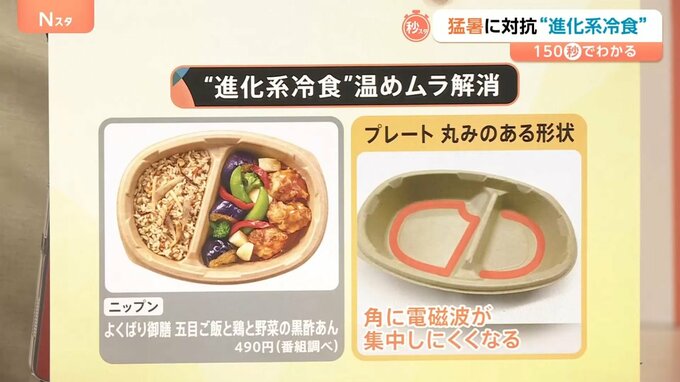 また、温めのムラを解消するために、ニップンの「よくばり御膳 五目ご飯と鶏と野菜の黒酢あん」(490円/番組調べ)では、プレートを丸みのある形状にしています。