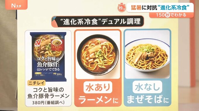 ニチレイの「コクと旨味の魚介豚骨ラーメン」(380円/番組調べ)は、その日の気分で、「水なし」にしてまぜそばにしたり、「水あり」にしてラーメンにしたりできるというものです。