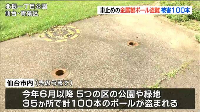 仙台市などによりますと市内では今年6月以降、同様の被害が相次いでいてきのうまでに5つの区の公園や緑地、35か所に設置されたあわせて100本のポールが盗まれたということです。