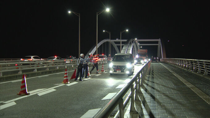 19年前、飲酒運転の車に追突され幼いきょうだい3人が亡くなった福岡市東区の海の中道大橋では25日夜、検問が行われ、警察官が運転手の呼気を確認しました。