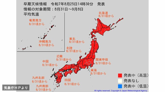 気象庁は8月25日(月)に最新の「高温に関する早期天候情報」を発表。この情報によりますと、全国(北海道・東北・関東甲信・北陸・東海・近畿・中国・四国・九州北部・九州南部・奄美・沖縄)で、8月31日~向こう2週間程度の気温が「かなり高く」なる見込みだということです。