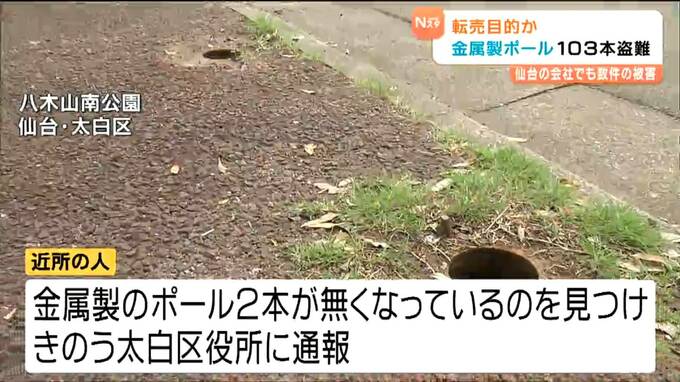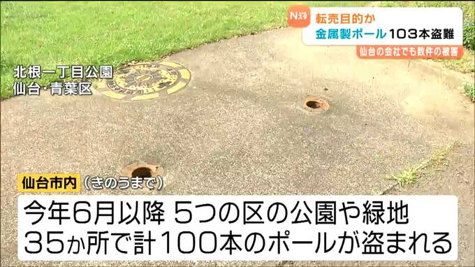 仙台市などによりますと市内では今年6月以降、同様の被害が相次ぎきのうまでに5つの区の公園や緑地、35か所に設置されたあわせて100本のポールが盗まれたということです。