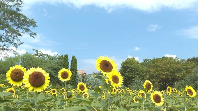 ひまわり畑に隣接した畑には、鮮やかなグリーンが目を引くコキアも植えられています。1カ月後には葉が赤く染まり、秋の深まりを感じさせてくれるということです。夏のヒマワリとコスモスの共演する特別な景色は、今週いっぱい楽しめそうです。