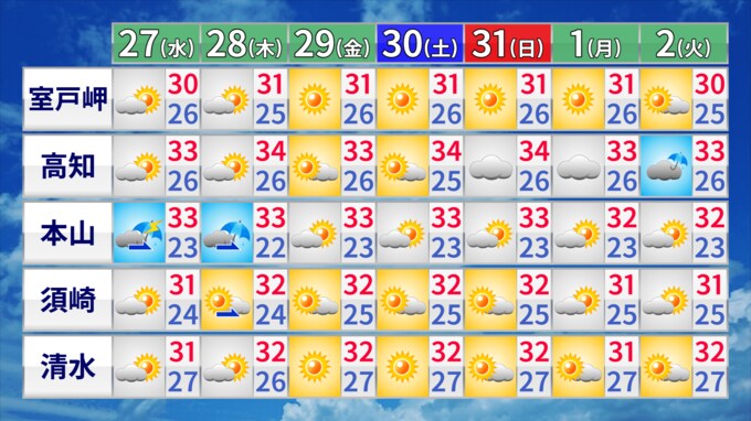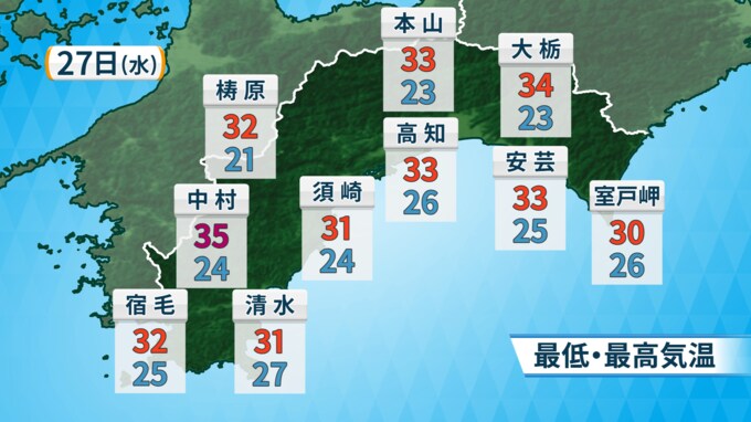 朝の最低気温は、前日と同じくらいかやや低くなるところが多いでしょう。日中の最高気温は、前日よりも高くなるところもあり、四万十市中村では35度の猛暑日予想となっています。熱中症対策を忘れずに行うようにしてください。
