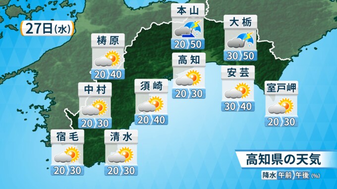 27日の高知県内は、前線や湿った空気の影響で概ね曇り、雨や雷雨となるところがあるでしょう。昼過ぎから夕方は非常に激しい雨の降るところがある見込みです。